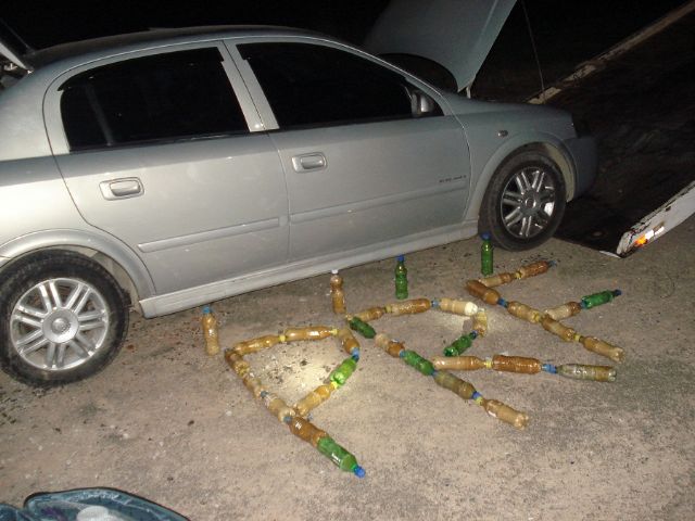 As drogas estavam acondicionadas em garrafas pet, no interior do tanque de combustível do veículo.
