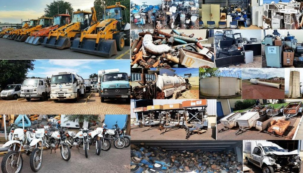 Os lotes compreendem máquinas pesadas como retroescavadeiras, caminhões, motocicletas; também sucatas, fogões, geladeiras, armários, entre outros bens