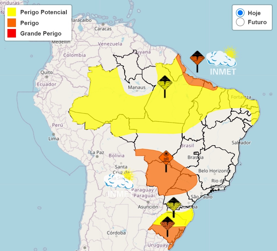 Estão na área de perigo cidades como Uruguaiana, Santa Maria, Bagé, Pelotas e a capital gaúcha, Porto Alegre.