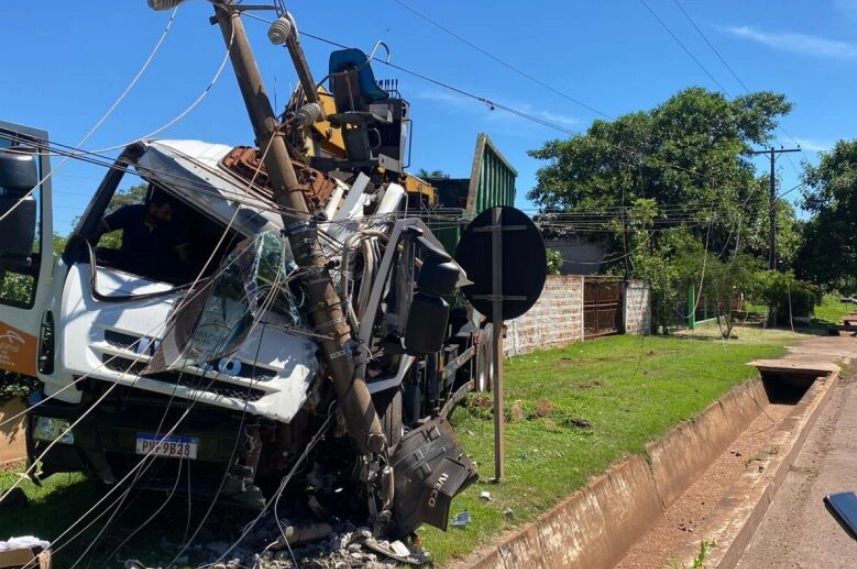 Na tarde desta quarta-feira (19), um caminhão colidiu violentamente contra um poste na entrada da Vila São Pedro, em Dourados. O motorista perdeu o controle da direção antes de atingir a estrutura.