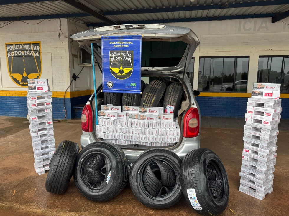 A abordagem ocorreu após os policiais visualizarem um veículo Citroën/Xsara Picasso com vidros excessivamente escuros e a suspensão visivelmente rebaixada, o que levantou suspeita e motivou a fiscalização. Durante a vistoria, foram encontrados diversos pacotes de cigarros de marcas variadas, além de bolas contendo pneus novos, todos de procedência estrangeira.