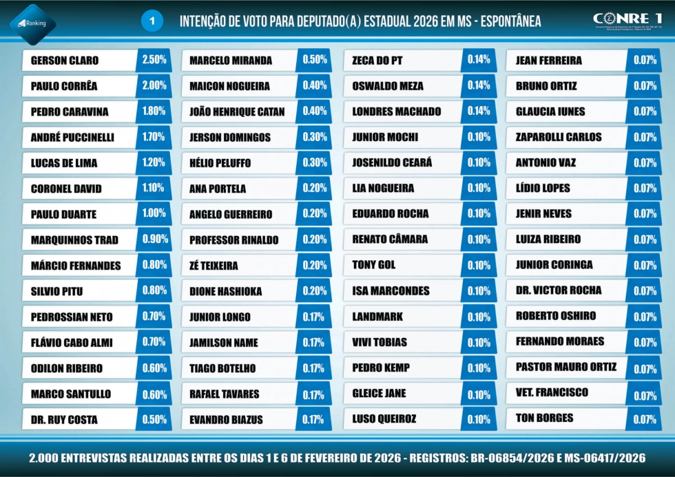 Mesmo sem ter anunciado oficialmente pré-candidatura a deputado estadual, Ceará aparece à frente de figuras tradicionais da política sul-mato-grossense. Entre os nomes citados, ele supera deputados petistas como Pedro Kemp e Gleice Jane, além do deputado estadual Roberto Hashioka, de Nova Andradina, que sequer foi mencionado na pesquisa.