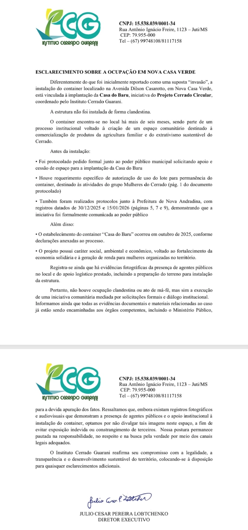 O Instituto Cerrado Guarani divulgou nota pública rebatendo declarações atribuídas ao diretor da Agência de Habitação de Nova Andradina (Agehnova), Vicente Lichoti, sobre uma suposta invasão de terreno na Avenida Dilson Casarotto, em Nova Casa Verde, distrito de Nova Andradina. Segundo a entidade, a instalação de um container no local não configura “ocupação clandestina”, mas integra a implantação da chamada “Casa do Baru”, vinculada ao Projeto Cerrado Circular.