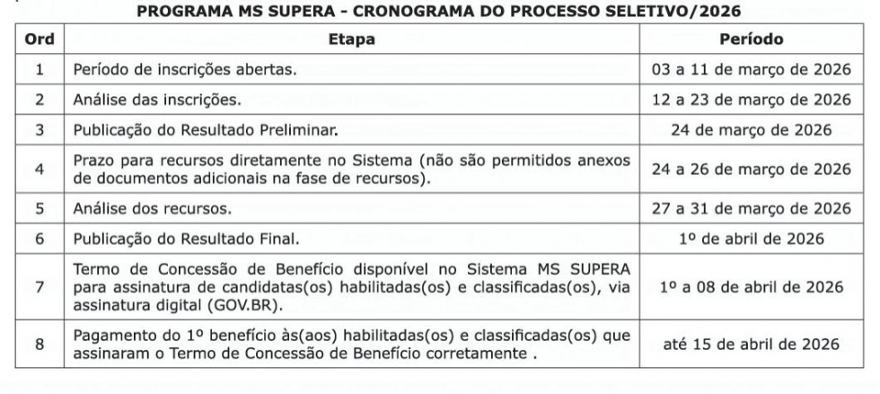 Criado para reduzir barreiras financeiras no acesso e permanência no ensino, o MS Supera concede auxílio mensal de R$ 1.621 a estudantes matriculados em cursos de graduação e formação técnica. O benefício busca garantir melhores condições para que acadêmicos de baixa renda possam se dedicar aos estudos e ampliar suas perspectivas profissionais.