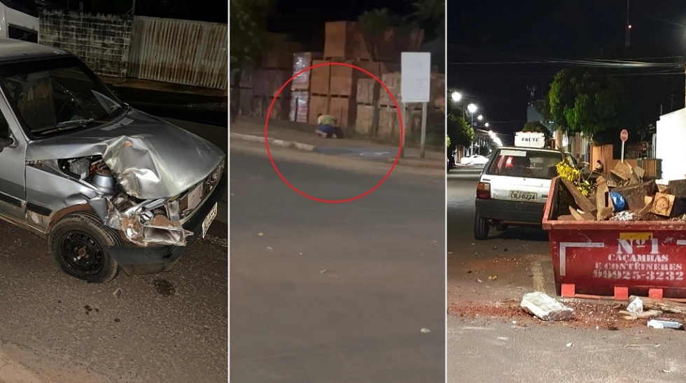 Um veículo Fiat/Uno colidiu contra uma caçamba de entulhos na noite de domingo (8), na rua Walter Hubacher, região central de Nova Andradina. O motorista, que apresentava sinais de embriaguez, fugiu do local antes da chegada da Polícia Militar.