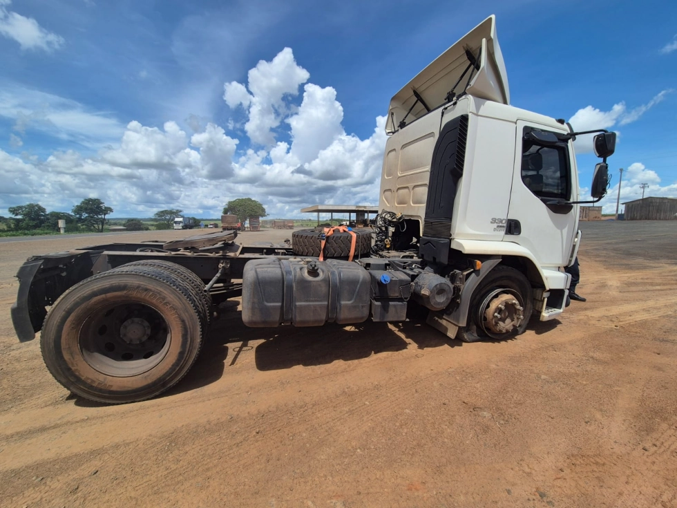 No local, os policiais encontraram um caminhão Volvo/VM 330, de cor branca, apenas o cavalo mecânico, sem a carreta acoplada e apresentando avarias.