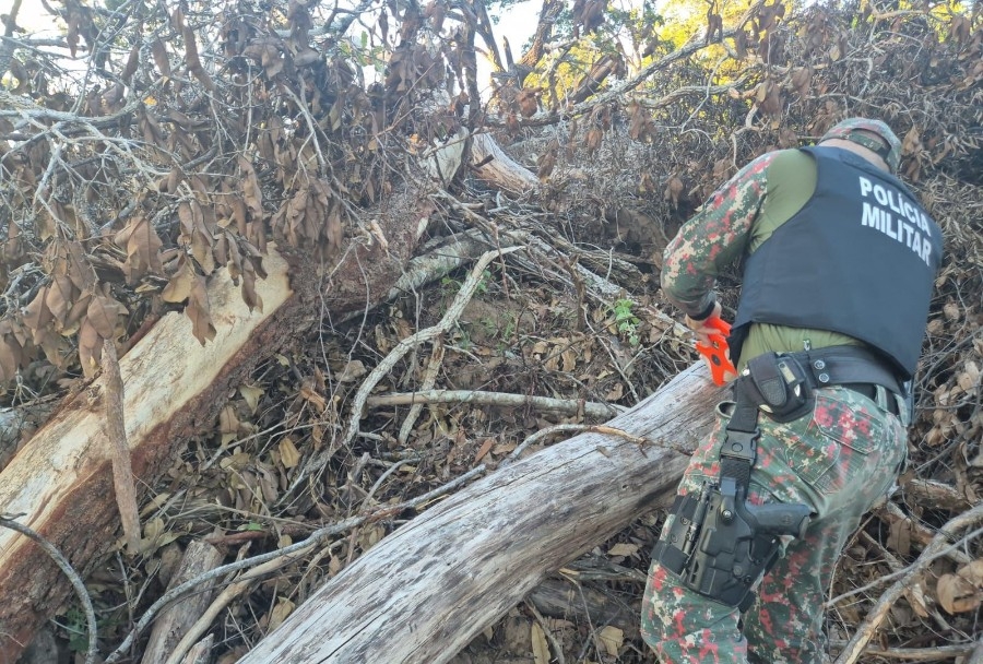 No local, os policiais verificaram a supressão irregular de vegetação nativa, com a derrubada de árvores de grande porte em desacordo com a licença ambiental apresentada. Conforme a fiscalização, a intervenção ocorreu em diferentes pontos da propriedade, onde também foi identificada a abertura de uma estrada interna sem autorização do órgão competente.