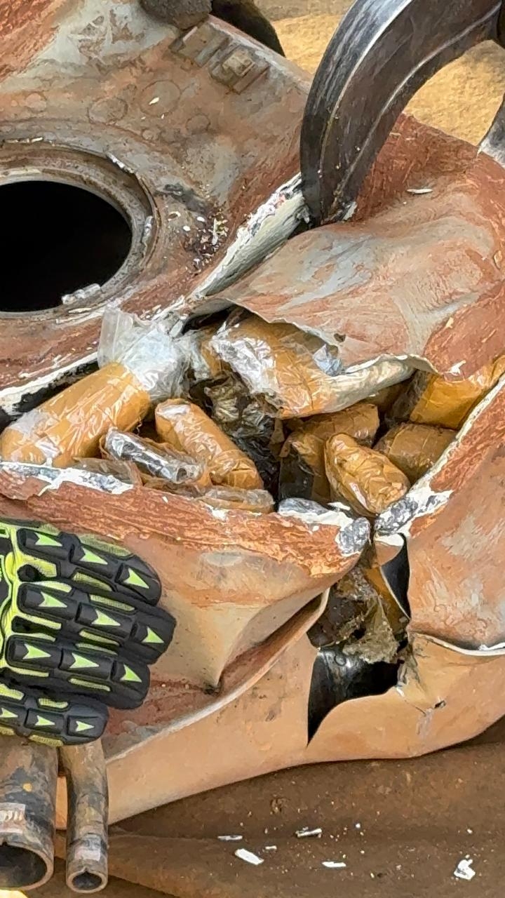Com apoio do Corpo de Bombeiros Militar, o tanque foi removido e aberto. Dentro dele, os policiais encontraram 88 invólucros de haxixe marroquino, totalizando cerca de 9,3 quilos.