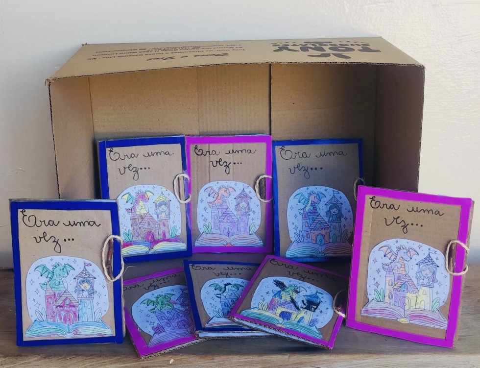 Durante a atividade, os participantes da turma "Sementinha" produziram um “livro ecológico” a partir de caixas de papelão e outros materiais recicláveis. A proposta envolveu a construção coletiva de histórias, aliando contação e ilustração, com participação ativa das crianças no desenvolvimento do enredo, sob mediação das monitoras sociais.