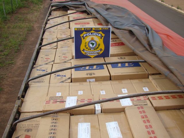 Uma carga com 35.000 pacotes de cigarros contrabandeados do Paraguai foi apreendida Pela Polícia Rodoviária Federal (PRF) em Jaraguari, no km 532 da Rodovia BR 163 às 14h deste último sábado (11), a carga estava no veículo VOLVO/FH 12 com placas do Rio Grande do Sul, acoplado ao semi-reboque com placas de MS.
