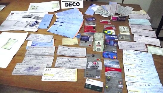 Com a quadrilha foram apreendidos vários cheques de terceiros, todos em branco, documentos de identidade, inúmeros cartões bancários, todos estes materiais utilizados para aplicar os golpes.