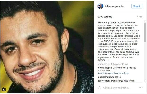 Felipe Araújo fez uma homenagem emocionante ao irmão, Cristiano Araújo, que morreu no dia 24 de junho de 2015. Nesta sexta (24), dia em que se completa um ano da morte do sertanejo - vítima de um acidente de carro - ele postou uma foto de Cristiano no Instagram e um texto se declarando. Confira abaixo: