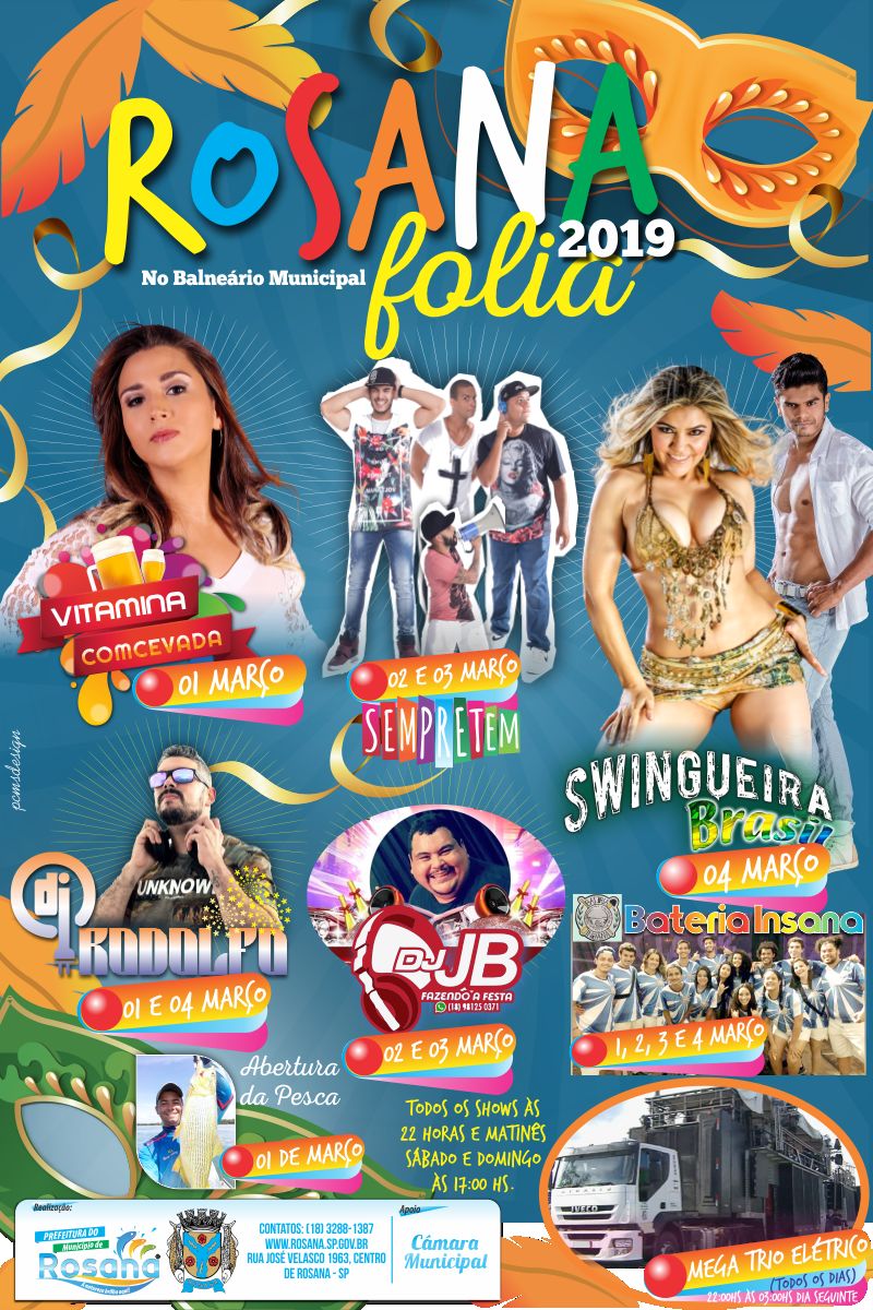 Você folião, está convidado a participar do Rosana Folia 2019. Serão quatro dias de folia. Neste ano a Prefeitura de Rosana inovou, e você poderá mais uma vez curtir um dos maiores eventos realizados pela Prefeitura Municipal de Rosana. Durante 4 dias o Balneário Municipal de Rosana (SP), será palco do maior Carnaval da região. Você está convidado a conhecer este local mágico, com o mais belo pôr do Sol do Pontal.