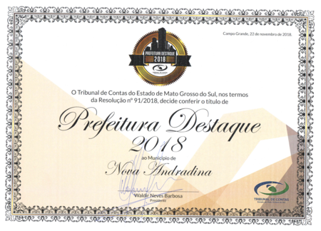 A gestão de Nova Andradina também foi destaque em premiações por Transparência e Eficiência na Gestão Pública - Ano de 2018. Instituições de avaliação da transparência dos atos públicos e de pesquisa de opinião pública aprovaram o bom desempenho da gestão do prefeito Gilberto Garcia no ano 2018 e concederam premiações nacionais e estaduais pela aplicação de recursos, publicação de dados em portais na internet e serviços prestados à sociedade.