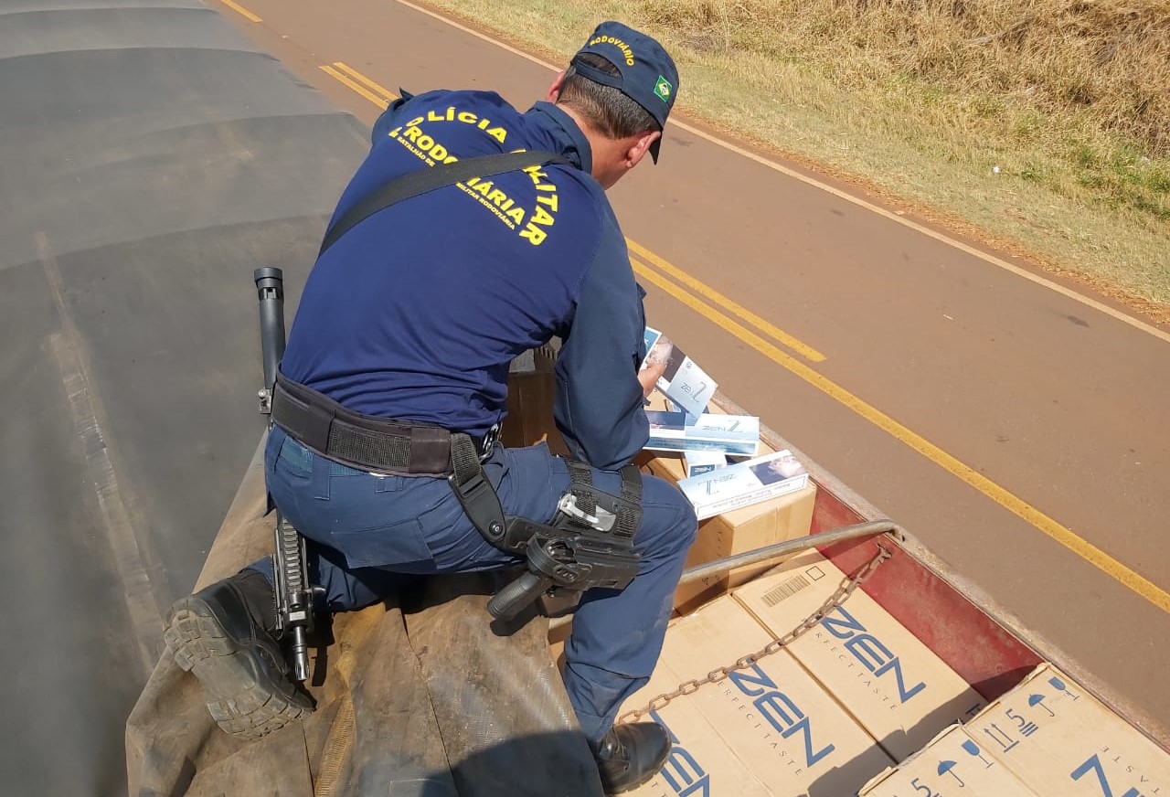 A PMR (Polícia Militar Rodoviária) da base operacional de Amandina, apreendeu na manhã de hoje (16), uma carreta carregada com 42,5 mil pacotes de cigarros paraguaios, na MS-145, em Angélica.