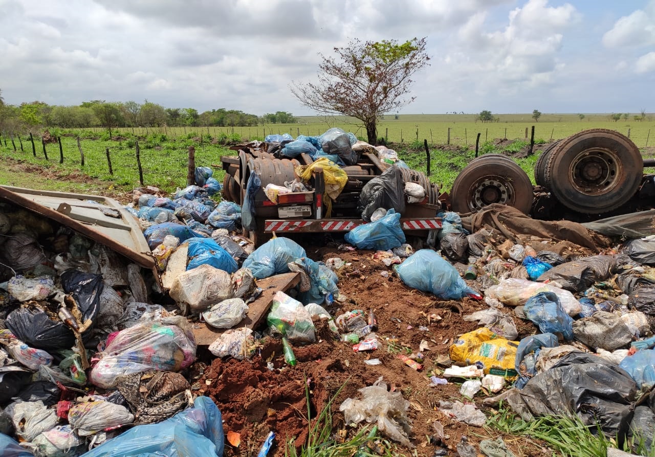 |Caminhão carregado com lixo sai da pista e capota entre Bataguassu e Brasilândia