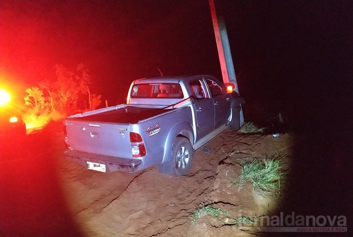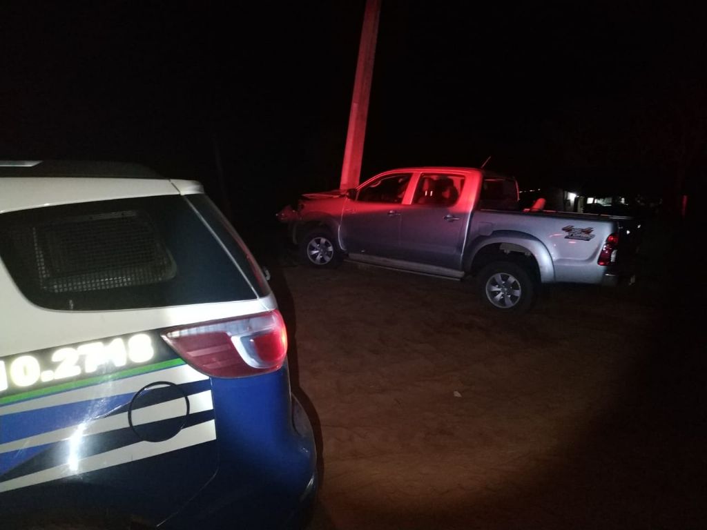 Tanto a caminhonete quanto o poste, ficaram avariados, os bandidos fugiram pela vegetação.