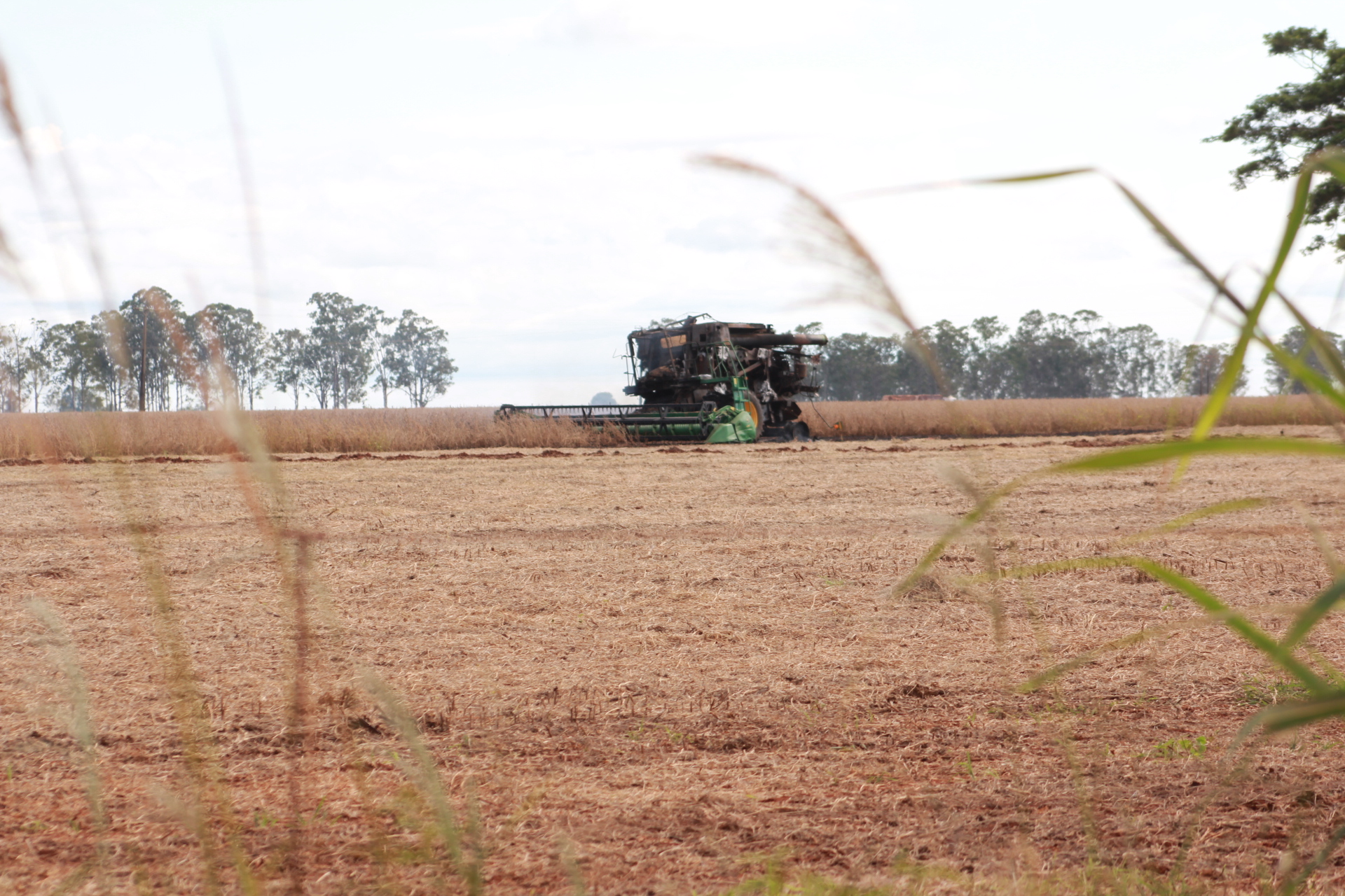 O maquinário estava em plena colheita de soja quando veio a pegar fogo no meio da roça