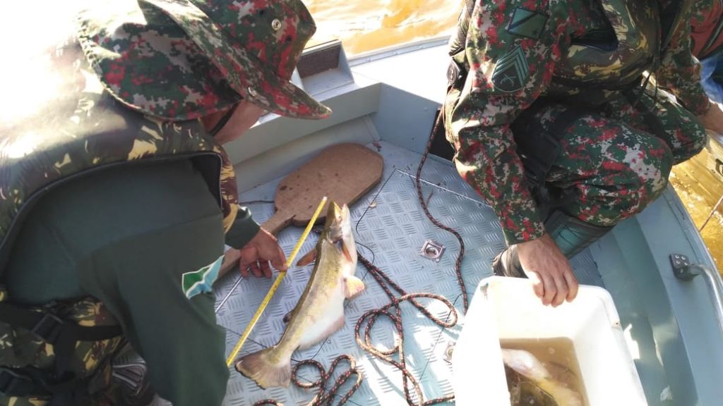 Dois infratores, um de 35 anos, residente em Icaraíma (PR) e outro de 32 anos, residente em Itaquiraí, foram autuados quando estavam em uma embarcação, nas proximidades da ponte da BR-487 e pescavam com espinhel (petrecho proibido).