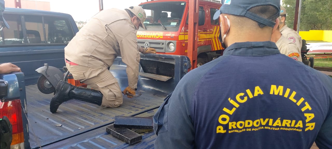 Ao realizar uma busca minuciosa no veículo, os policiais localizaram diversos tabletes de maconha em um compartimento oculto na carroceria. Foi necessário apoio de uma equipe do Corpo de Bombeiros para a abertura do compartimento. A cônjuge alegou não ter conhecimento da droga.