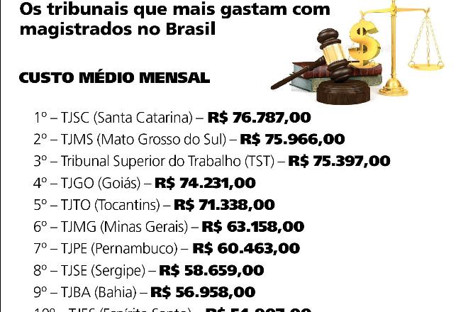 O TJMS só não gasta mais com juízes e desembargadores do que o Tribunal de Justiça de Santa Catarina, onde o custo é de R$ 76.687,00.