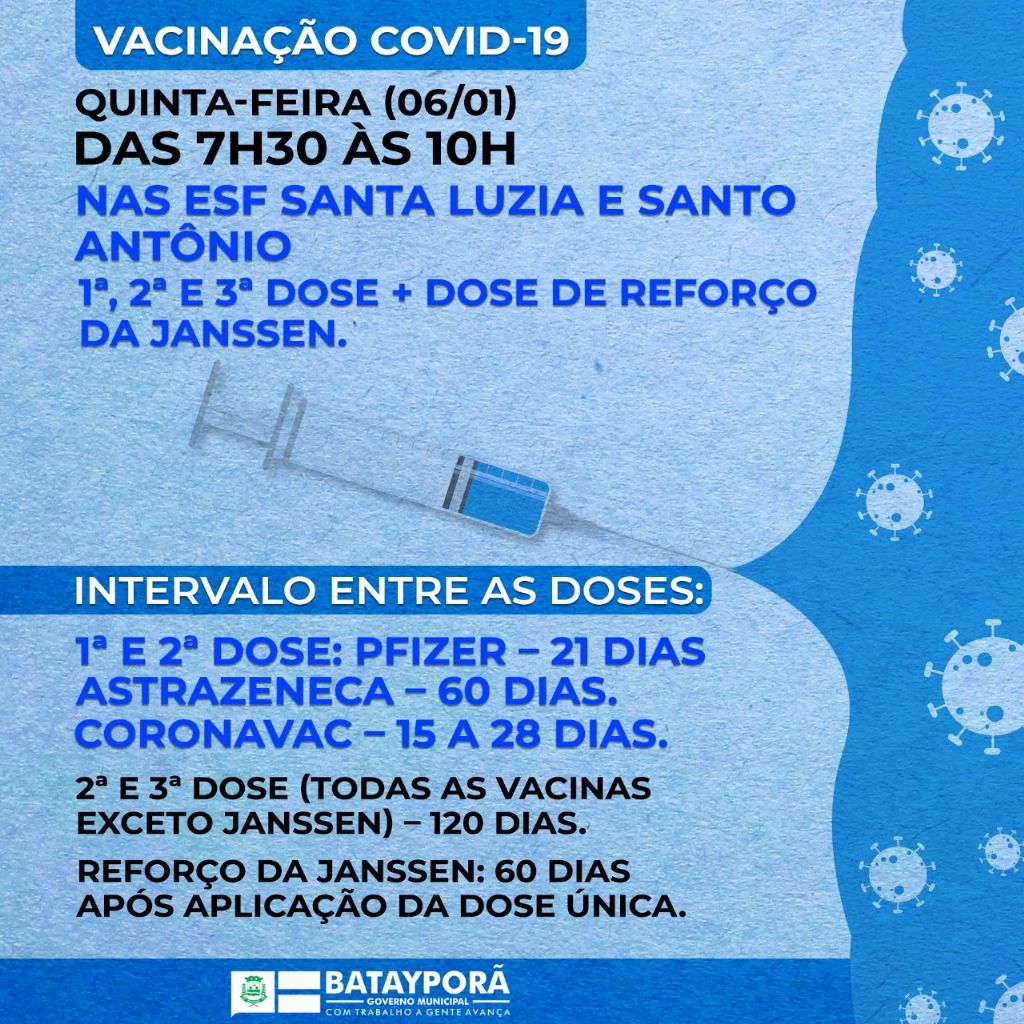 A Secretaria Municipal de Saúde de Batayporã amplia a vacinação contra a Covid-19 nesta quinta-feira (06). Os imunizantes serão ministrados das 7h às 10h nas Estratégias de Saúde da Família (ESF) Santa Luzia e Santo Antônio para todos os públicos a partir de 12 anos já incluídos na campanha.