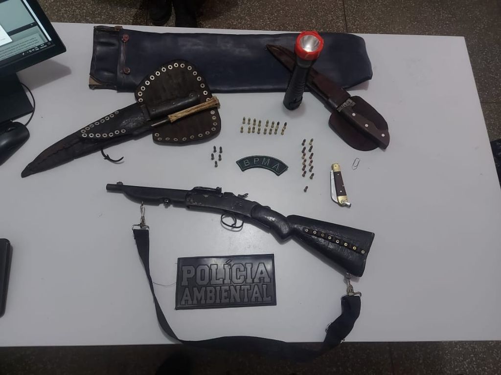 Na abordagem, os homens demonstraram nervosismo e na busca pessoal, foram encontrados em uma sacola, um rifle calibre 22 com 34 munições do mesmo caibre, uma faca, um facão, um canivete e uma lanterna. Os infratores estavam praticando caça no local, mas não tiveram tempo de abater nenhum animal. O caçador, de 67 anos, assumiu ser proprietário da arma e munições e não possuía documentação. Todo o material foi apreendido.
