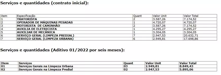 Dos novos funcionários, dois serão alocados em serviços gerais na limpeza predial e os outros três irão atuar nos serviços gerais na limpeza urbana. Confira a tabela com os valores dos serviços iniciais e o acréscimo dos novos funcionários: