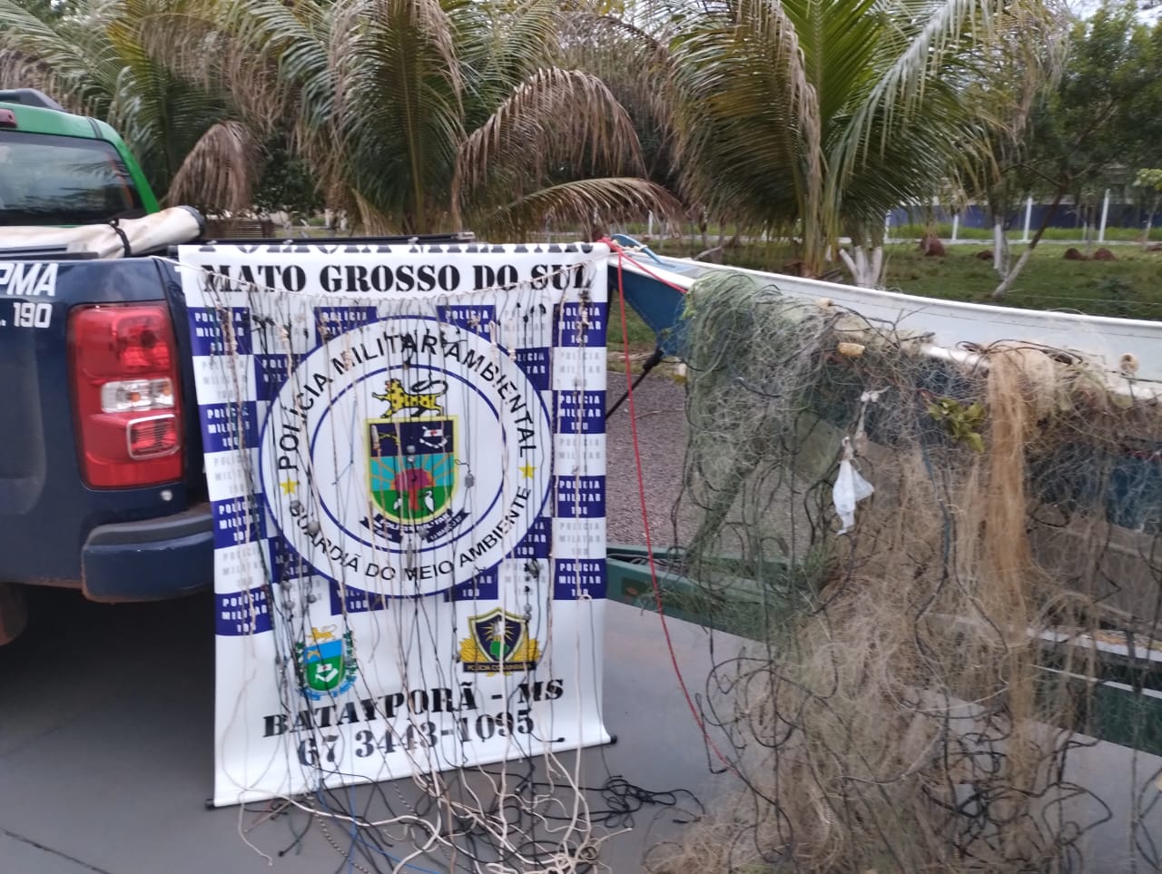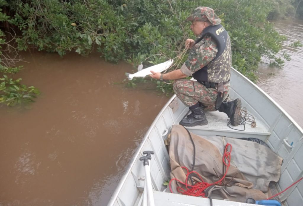 Policiais da PMA (Polícia Militar Ambiental) de Batayporã, que trabalham na “Operação Ictiofauna”, realizam fiscalização no rio Ivinhema nos municípios de Nova Andradina e Taquarussu, abrangendo a área do entorno do Parque Estadual das Várzeas do Rio Ivinhema e apreenderam diversos petrechos ilegais de pesca armados no rio.