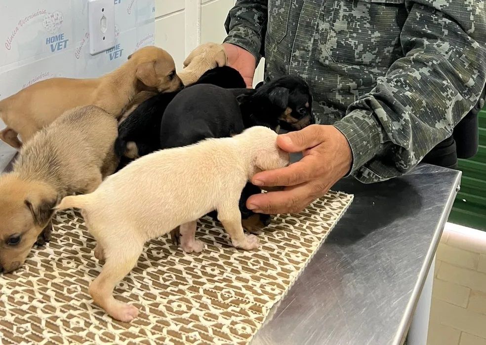 Conforme a Polícia Militar Ambiental, a equipe foi até a cidade para atender uma denúncia de maus-tratos a animais domésticos, pois uma pessoa desconhecida teria deixado uma caixa de papelão com filhotes de cachorro dentro.