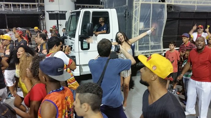 A empresária, musa dos compositores da agremiação, vestiu uma fantasia com muito brilho e um luxuoso sapato cravejado de cristais preciosa (que a mesma mandou trazer da republica Tcheca), uma prévia do que virá no desfile deste ano, que aposta no enredo adrenalina.