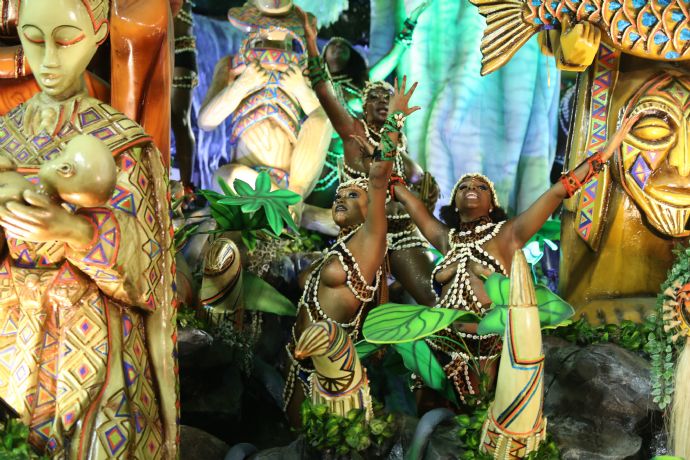 Na sequência, o sambódromo foi tomado por uma explosão de cores, rretratando os ritos, costumes e as roupas usadas pelos habitantes do pequeno país africano ainda hoje.