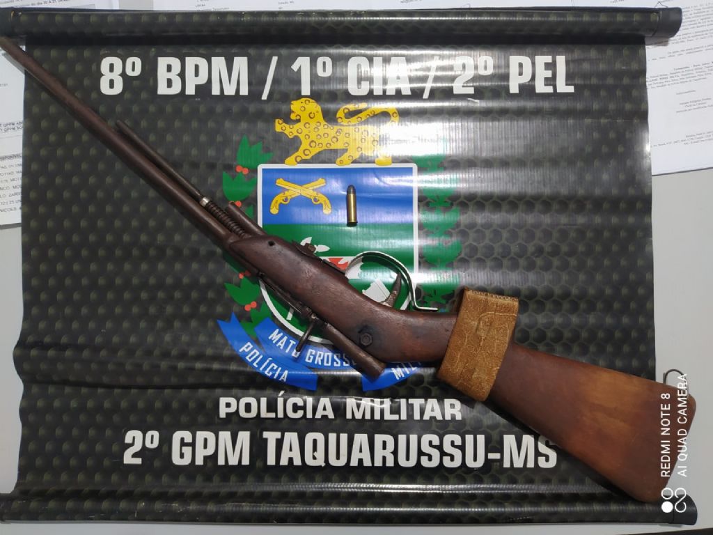 Um homem, de 44 anos, foi preso e autuado por violência doméstica e posse irregular de arma de fogo de uso permitido, na noite desse domingo (21), em Taquarussu.