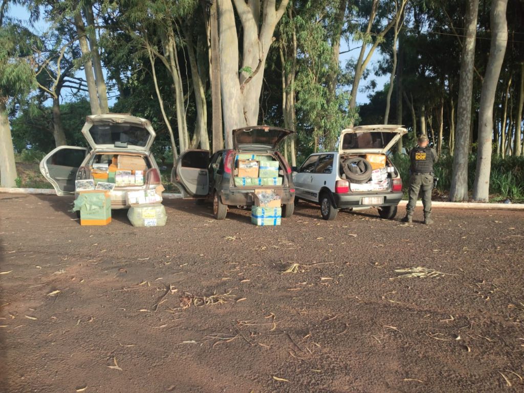 No veículo foram encontrados diversos pacotes de cigarros e pneus. Em checagem aos agregados foi constatado que as placas do Uno eram falsas. Ao todo, foram apreendidos nos três carros 9.300 relógios, 720 cigarros eletrônicos, 250 pacotes de cigarro, mil relógios e 50 pneus.