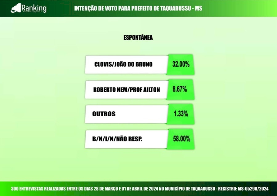 A pesquisa foi encomenda do site "Diário MS News" e registrada no TSE (Tribunal Superior Eleitoral) sob o nº MS-05290/2024. O Instituto Ranking ouviu 300 moradores de Taquarussu, entre os dias 28 de março e 1º de abril, com 16 anos ou mais de idade, uma pesquisa de intenção de votos para a Prefeitura Municipal nas eleições 2024, tendo intervalo de confiança de 95% e uma margem de erro de 5,6%, para mais ou para menos.