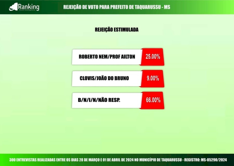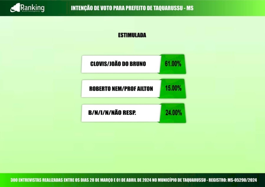 Levantamento ouviu 300 pessoas entre os dias 28 de março e 1º de abril em Taquarussu; margem de erro é de 5,6 pontos percentuais, e o nível de confiança é de 95%