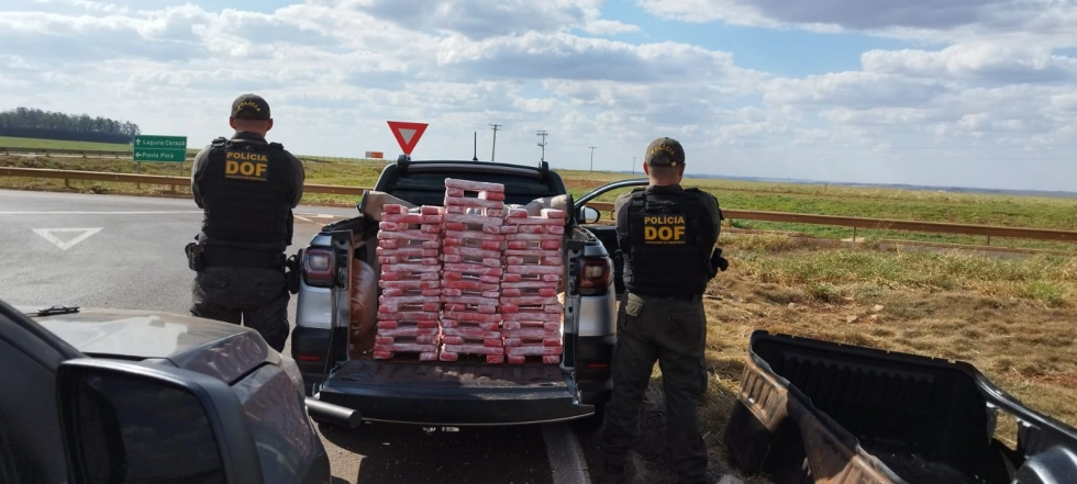 Policiais militares do DOF (Departamento de Operações de Fronteira) apreenderam, na tarde desse domingo (23), uma Fiat/Strada prata, carregada com 110 quilos de maconha, mais 144 gramas de skunk. Na ação, condutor e passageiro foram presos.