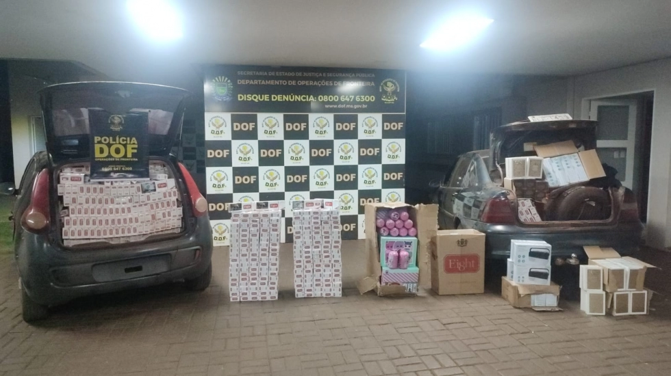 Policiais militares do DOF (Departamento de Operações de Fronteira) apreenderam, na tarde de terça-feira (25), um Fiat/Palio preto e um GM/Vectra, ambos carregados com cigarros, pneus, brinquedos, eletrônicos e perfumes.