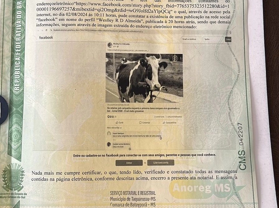 Para provar tudo que narrou no Boletim de Ocorrência, a primeira-dama Marilza Nunes de Araújo Nascimento apresentou Ata Notarial lavrada no cartório, onde todos os prints com ataques a ela, bem como os links das fake news publicadas pelo jornal "osulmatogrossense". "Vou até o fim para ver essas pessoas punidas pela justiça, porque não podemos considerar normal que invente mentiras com nossos nomes e continuem impunes", completou.