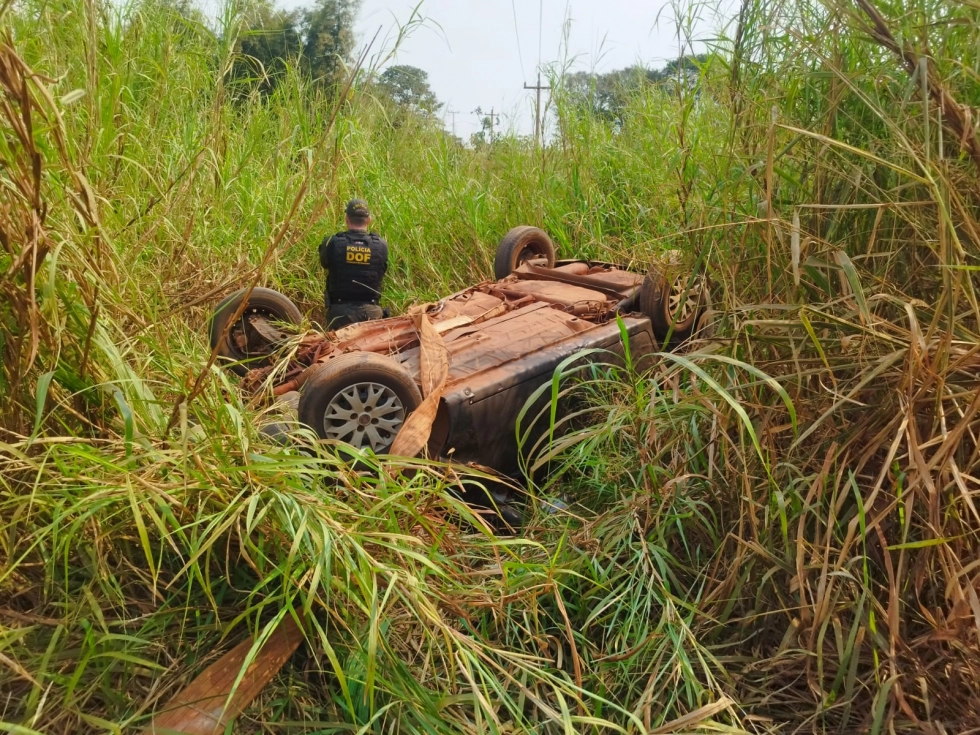Carro com mercadoria ilegal capota durante fuga da polícia em Laguna Carapã