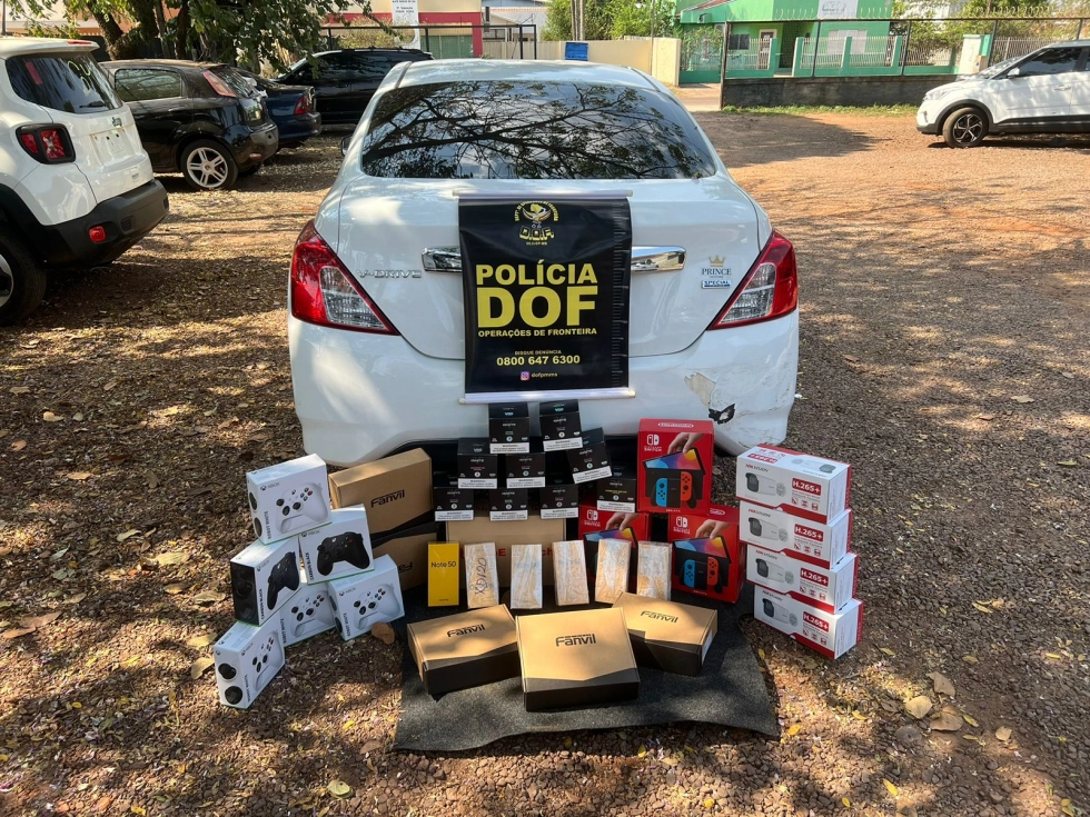 Ainda em Maracaju, o DOF apreendeu um veículo Nissan/V-Drive, na BR-267, carregado com eletrônicos, aparelhos de telefone celular e cigarros eletrônicos.