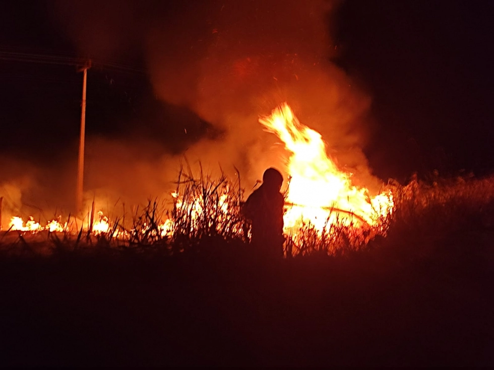 As chamas destruíram o carro e se propagaram para a vegetação na beira da pista