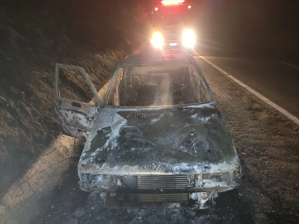 Um veículo pegou fogo e ficou totalmente destruído na noite desse domingo (6), na MS-134, trecho conhecido como "quebra-carcaça".