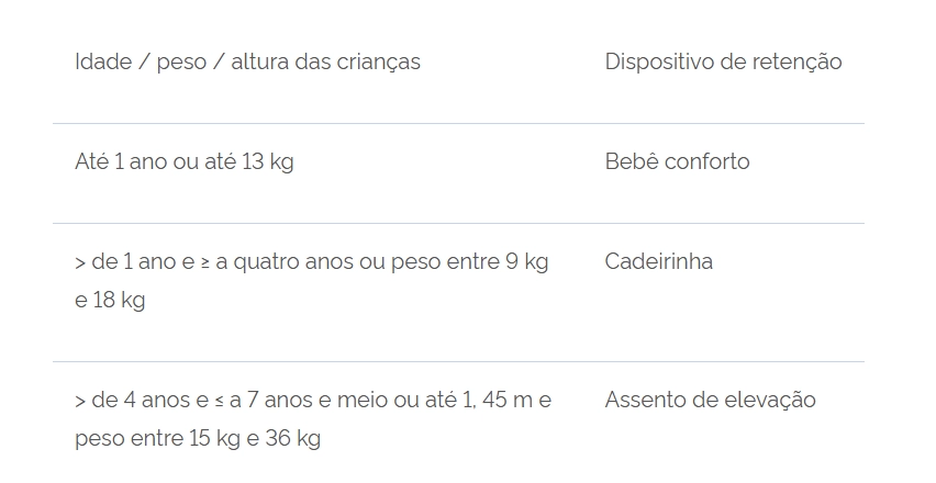 O uso dos dispositivos de retenção de crianças segue critérios de acordo com a idade, tamanho e peso dos passageiros. A tabela a seguir serve de orientação aos pais, mães e demais responsáveis: