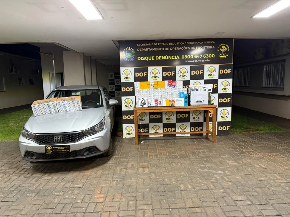 Os militares faziam bloqueio na MS-164, zona rural do município, quando abordaram um veículo Fiat/Argo. Durante vistoria, os policiais localizaram 131 aparelhos de telefone celular.