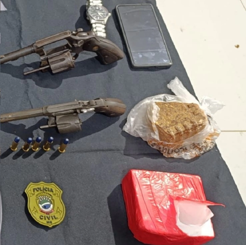 Durante a revista veicular, foi sentido um forte odor de maconha, o que levou à descoberta de cinco quilos de maconha, 500 gramas de cocaína e 256 gramas de crack, todos embalados em invólucros com fita adesiva. Também foram localizados dois revólveres calibre 38, das marcas Rossi e Taurus, ambos com numeração suprimida, além de cinco munições calibre 38.