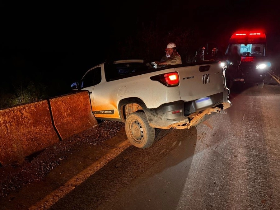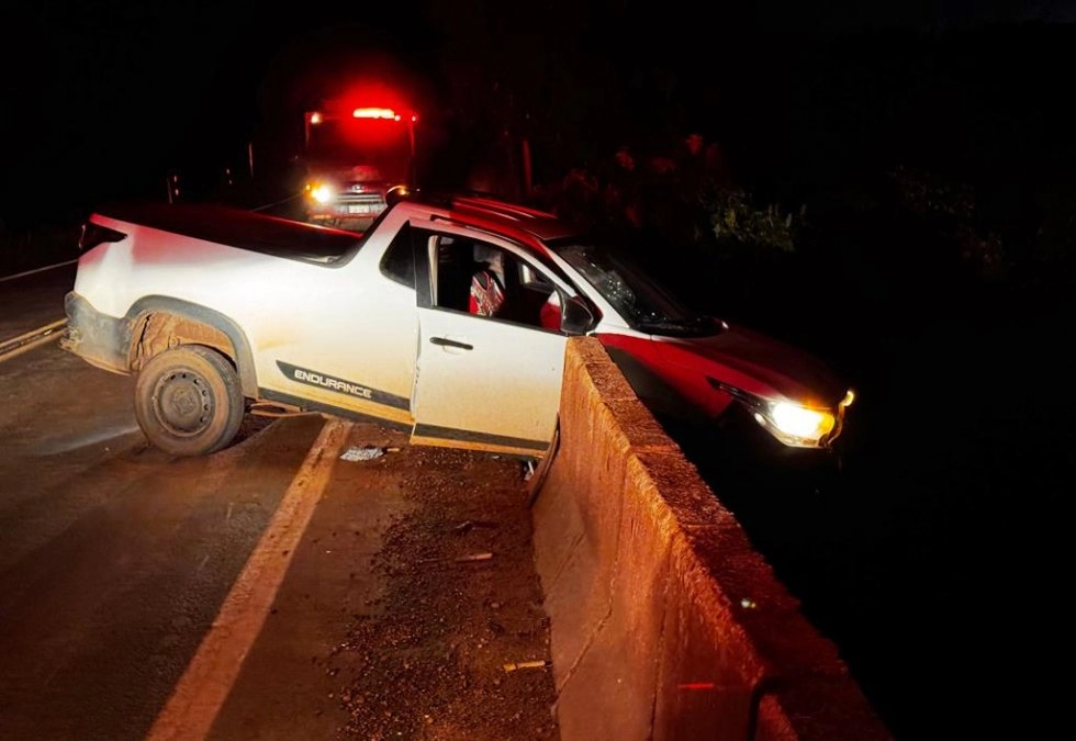 Uma picape Fiat/Strada quase caiu no Córrego Vitória, após condutor, de 48 anos, perder controle direcional e o veículo ficar suspenso em cima da ponte, na rodovia MS-141, entre Ivinhema e Naviraí. Acidente aconteceu noite desse domingo (8), por volta das 21h.