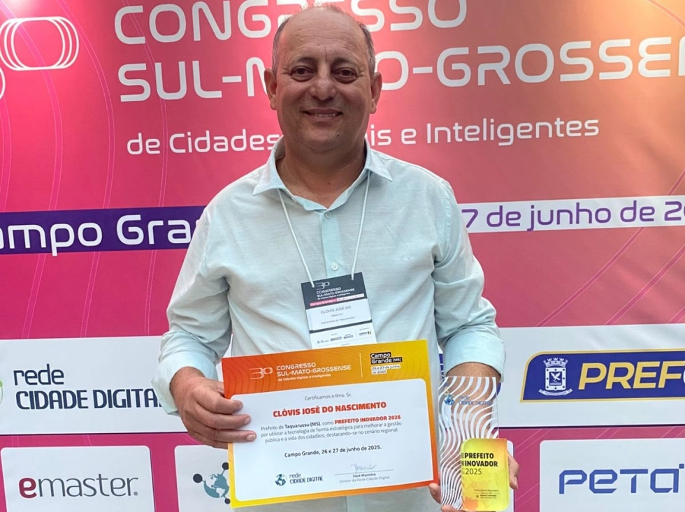 O prefeito Clóvis do Banco foi homenageado com o prêmio Prefeito Inovador de 2025, durante o 3º Congresso Sul-Mato-Grossense de Cidades Digitais e Inteligentes, realizado nos dias 26 e 27 de junho no auditório do Bioparque Pantanal, em Campo Grande. Ao lado do secretário de Comunicação Social, Edson da Rádio, Clóvis participou do evento que reuniu mais de 50 gestores municipais do Estado.