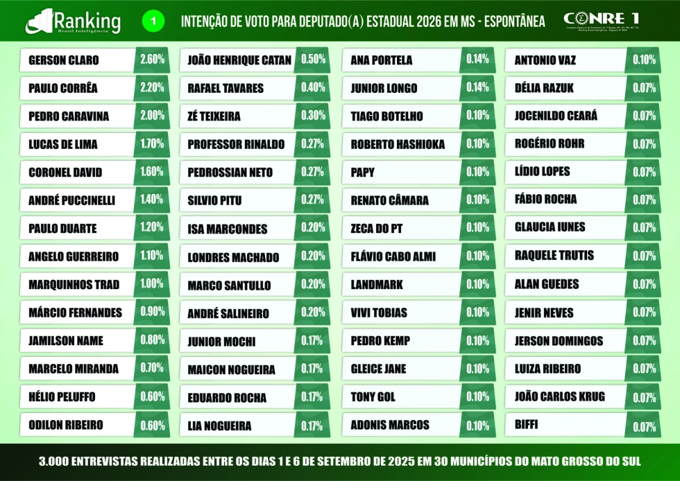 O vereador de Nova Andradina, Josenildo Ceará (PT), figura em sondagem estadual realizada pelo Instituto Ranking Brasil Inteligência, encomendada pela Rede de Rádios Top FM, de 1º a 6 de setembro, junto a 3 mil moradores com 16 anos ou mais em 30 municípios de Mato Grosso do Sul. A pesquisa apresenta um intervalo de confiança de 95% e margem de erro de 1,8 ponto percentual para mais ou para menos, trazendo as intenções de votos para as 24 vagas de deputados estaduais.