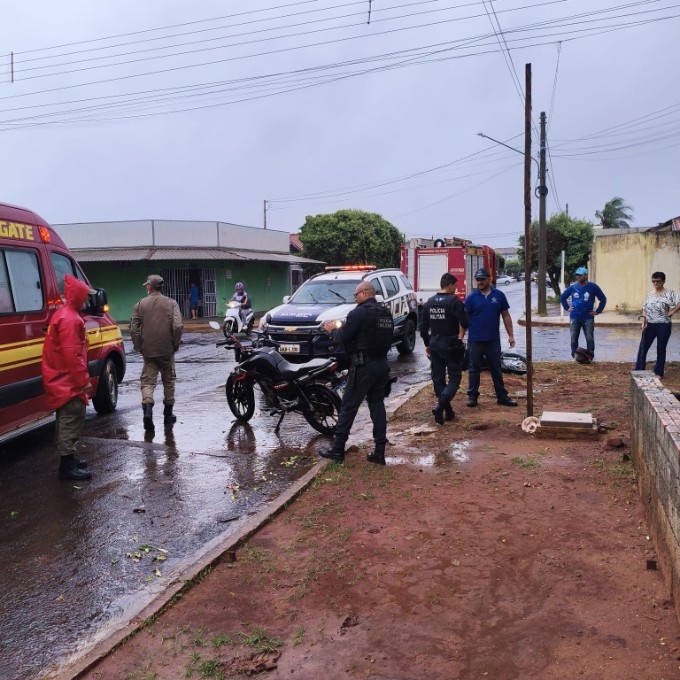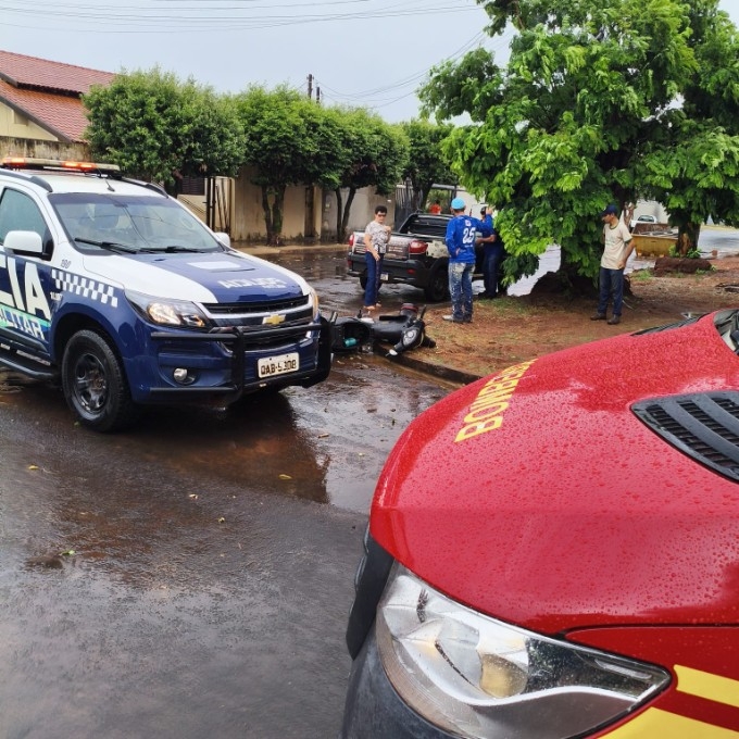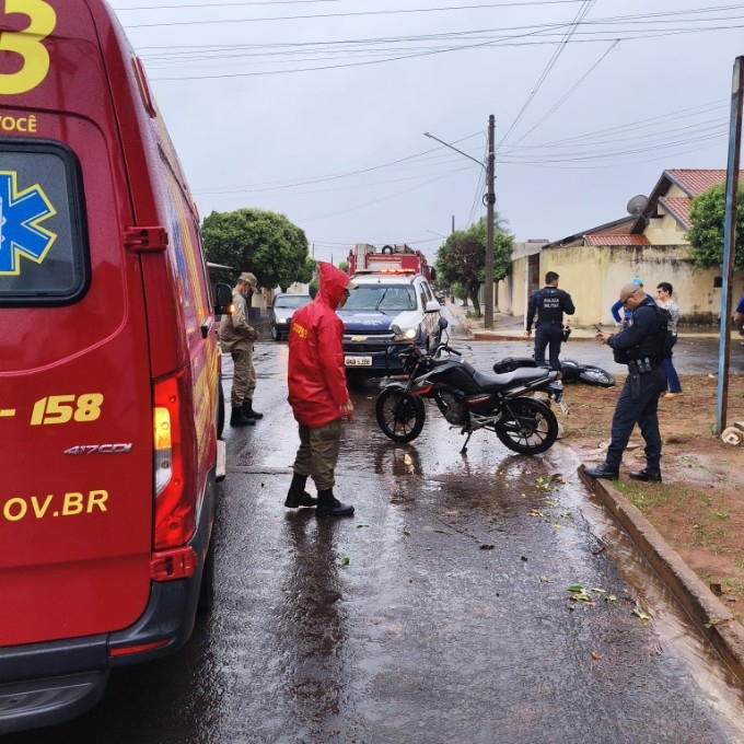 Uma colisão envolvendo duas motocicletas deixou uma pessoa com suspeita de fratura em uma das pernas e outra com escoriações, no início da tarde desta sexta-feira (13), em Nova Andradina. O sinistro de trânsito ocorreu na região central da cidade, no cruzamento das ruas Elizabeth Robiano e Sete de Setembro, em meio ao temporal que atingia o município naquele momento.